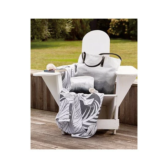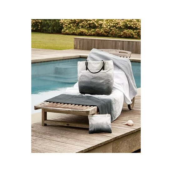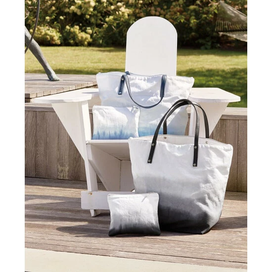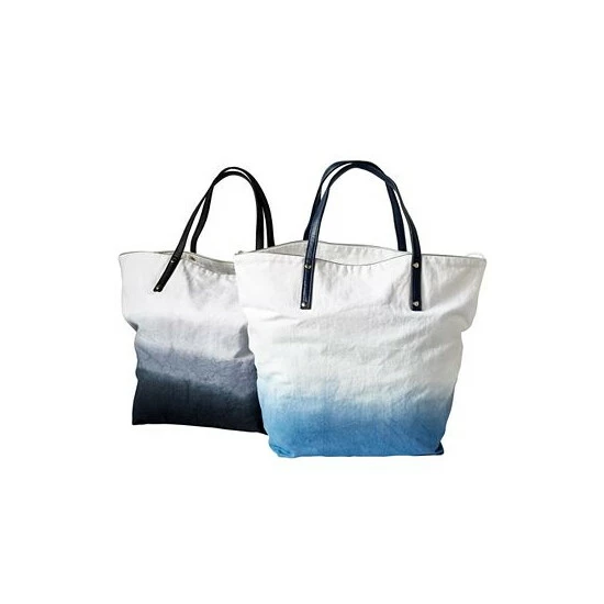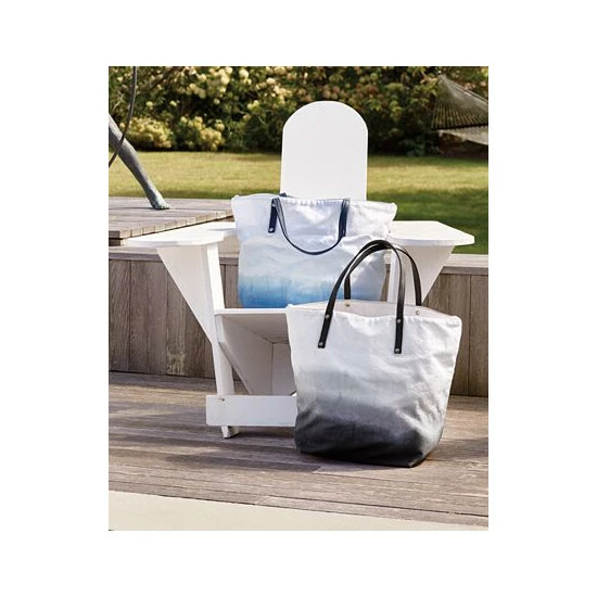A transition of dark to light is portrayed in the trendy Michael Aram Dip Dye Ombre Tote. The polished hand dipped dyed cotton canvas tote is available in two colorways of black and blue. The black ombre tote is detailed with a gold metallic trim and gold studs on the handles, while the blue ombre tote is detailed with a silver metallic trim and silver studs. The tote has two inside pockets, with one including a zipper. Each have a tie closure and plenty of room to carry all your vacation essentials.