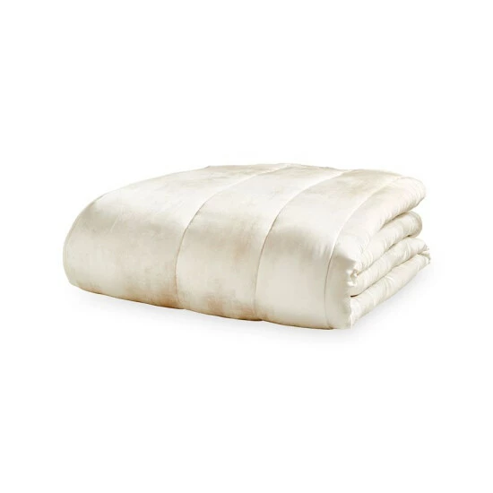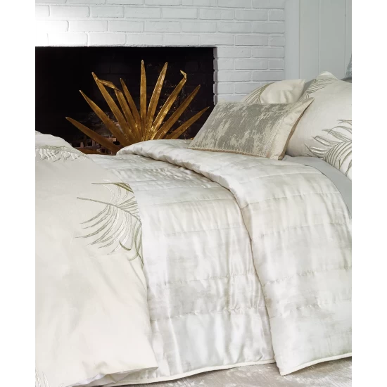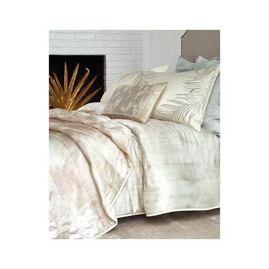 The cozy silk faced quilt is illustrated with a digitally printed ivory painterly watercolor and solid cotton reverse.