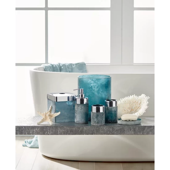 Etched textured seaglass with stainless steel accents are a classic touch to decorate the vanity.
