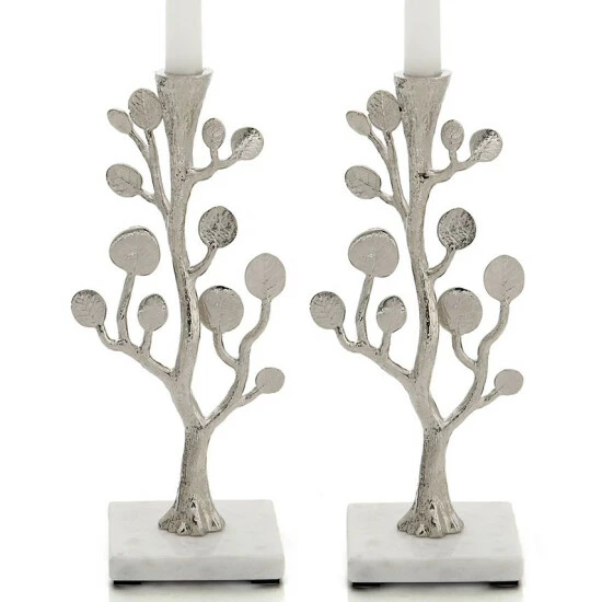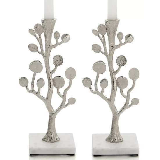 The artfully handcrafted Botanical Leaf candlesticks by Michael Aram feature organically styled branches of lustrous nickel plate sprouting from a white marble ground.